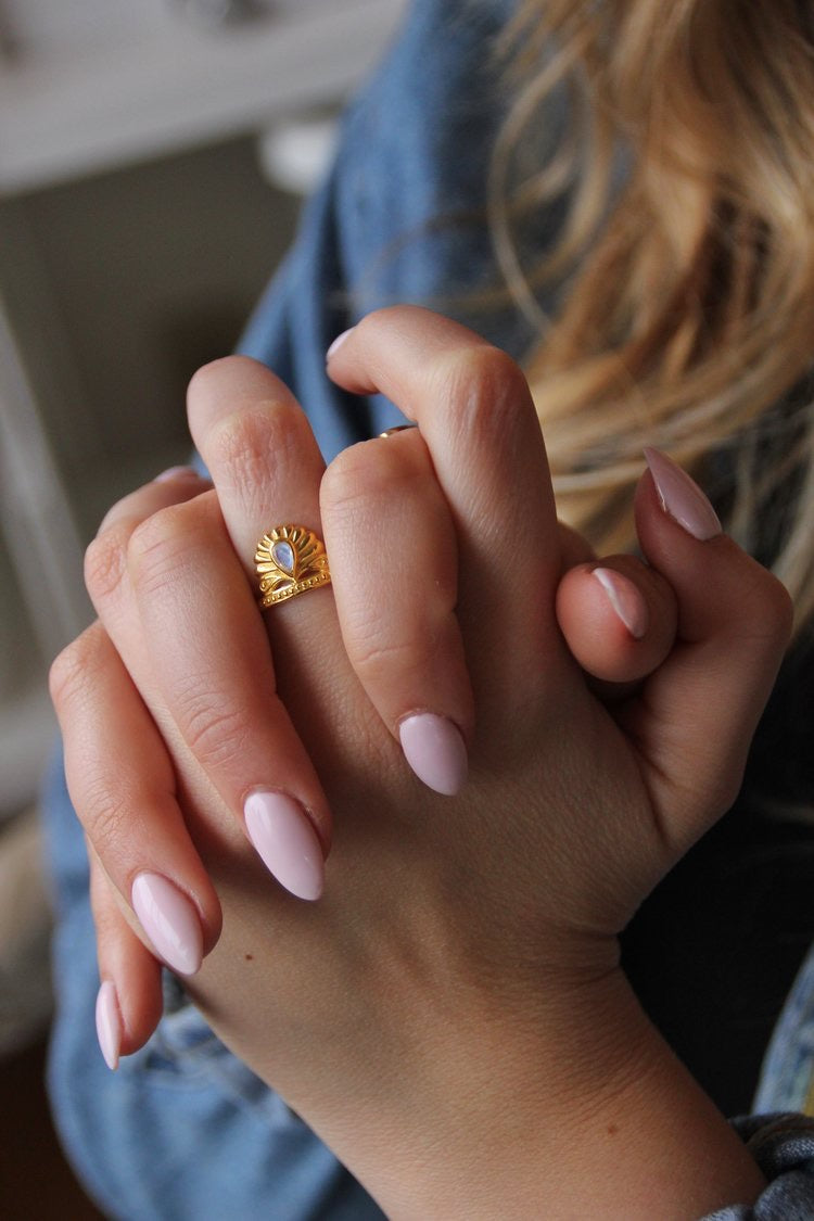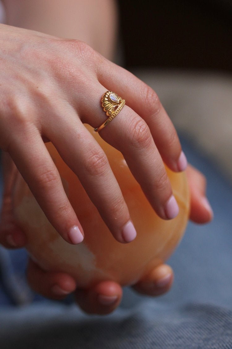 The Cozumel Ring is handmade with rainbow moonstone to reference Ixchel (pronounced eesh-chel), the Mayan goddess of the moon.