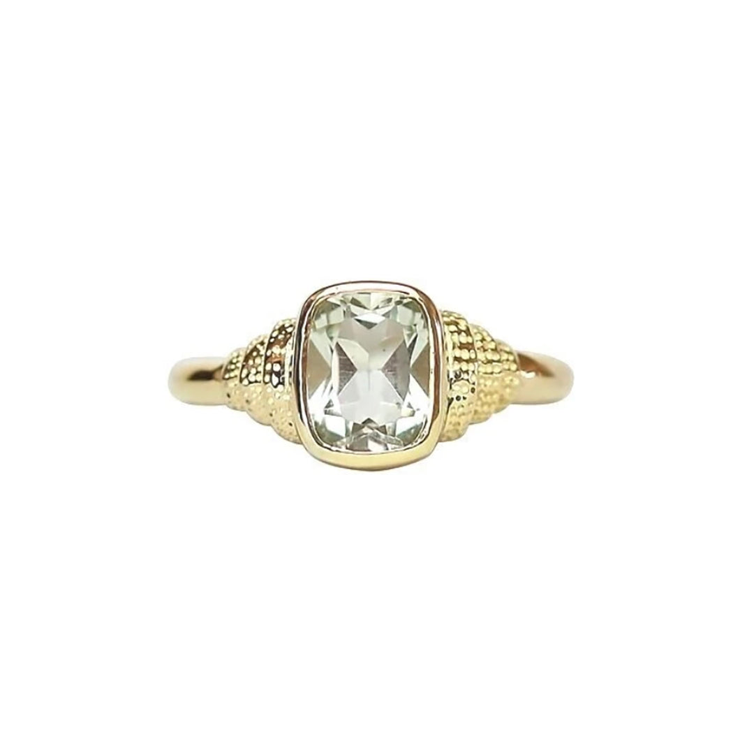 14K gold vermeil statement ring featuring a faceted cushion-cut green amethyst.